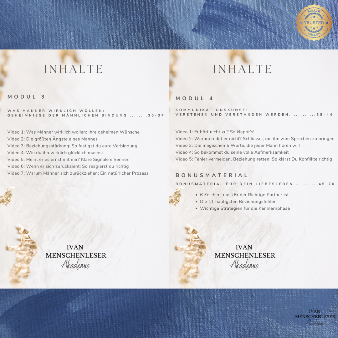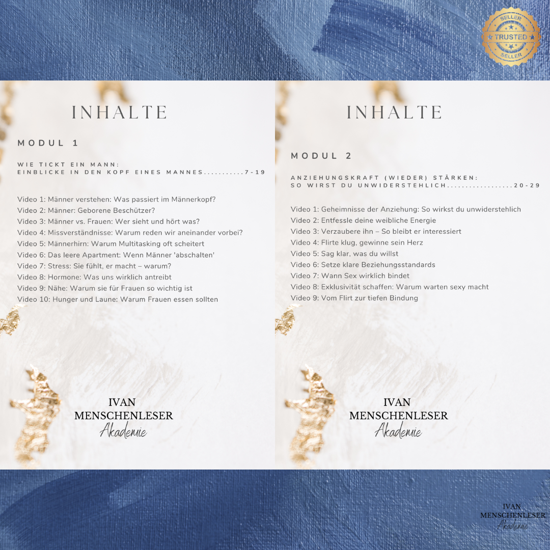 Mit mehr als 5 Stunden intensivem Videomaterial wirst du die Welt der Männer tiefenpsychologisch durchleuchten und dabei glasklare Einblicke gewinnen.